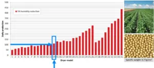 Među mobilnim sušarama s prekidnim ciklusom, potrebno je odabrati najprikladniju veličinu i kapacitet za dnevni volumen proizvoda koji se suši. To se određuje na temelju vrste žitarica koje se suše, sezonskih količina i svrhe naknadnog tretmana sušenja. Tablica u nastavku prikazuje tipične postotke uklonjene vlage po satu sušenja: